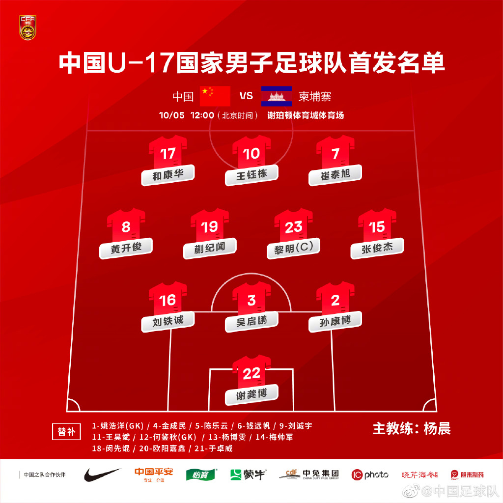 U17国足首发:22-谢龚博、16-刘铁诚、3-吴启鹏、2-孙康博、8-黄开俊、19-蒯纪闻、23-黎明、15-张俊杰、17-和康华、10-王钰栋、7-崔泰旭