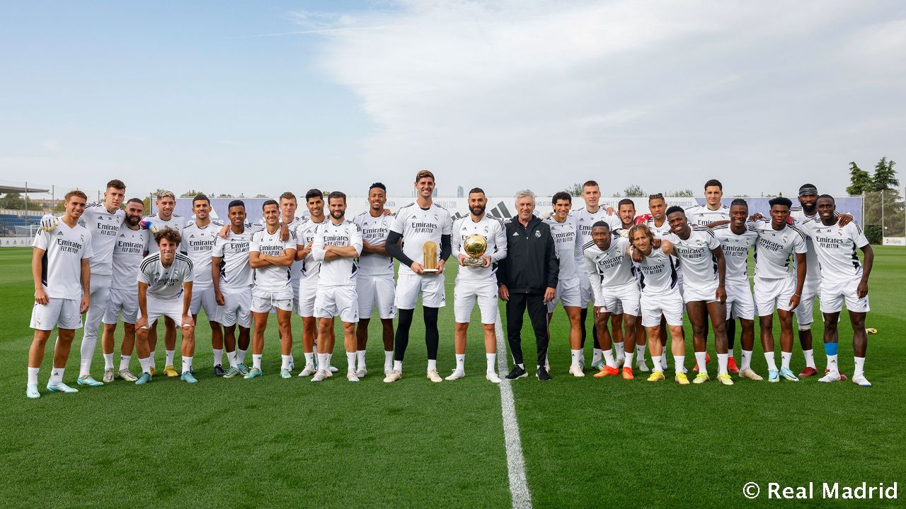 📸皇马晒大合影:本泽马手捧金球、库尔图瓦手捧雅辛奖C位