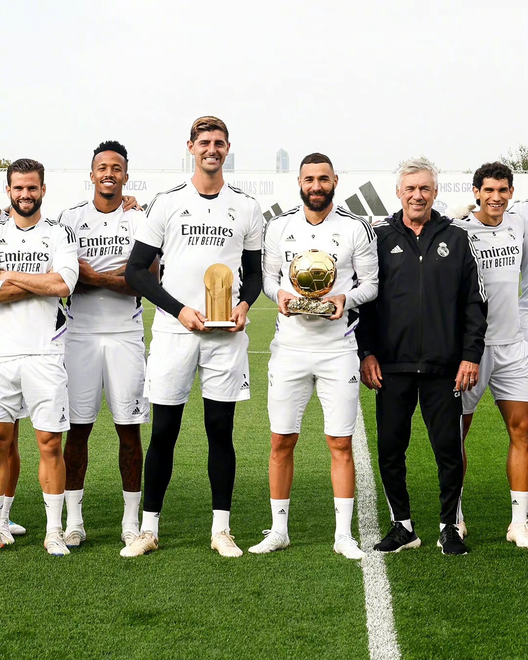 >📸皇马晒大合影:本泽马手捧金球、库尔图瓦手捧雅辛奖C位