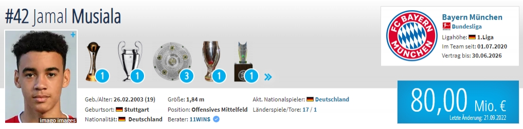 年龄:19岁 国籍:德国 现效力球队:拜仁