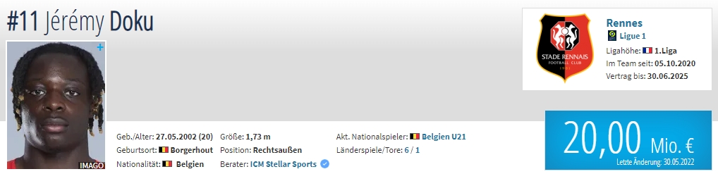年龄:20岁 国籍:比利时 现效力球队:雷恩