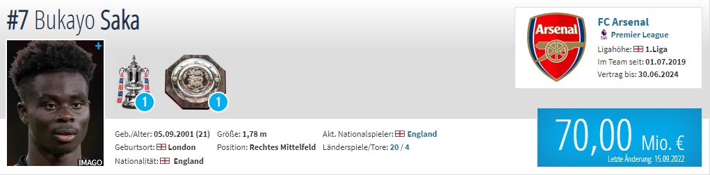 年龄:21岁 国籍:英格兰 现效力球队:阿森纳