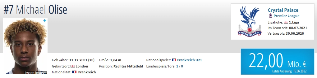 年龄:20岁 国籍:法国 现效力球队:水晶宫