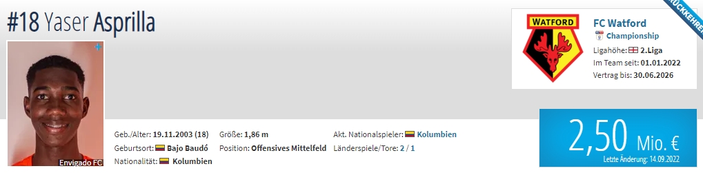年龄:18岁 国籍:哥伦比亚 现效力球队:沃特福德