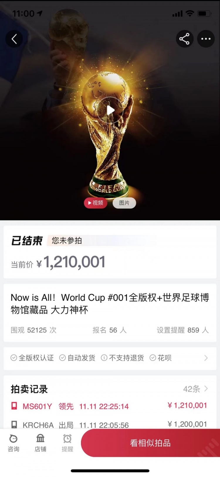 最终这座FIFA授权的大力神杯在中国以121万的价格拍卖成交了。