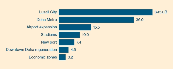 据报道,本次举办赛事的八个体育场有七个均是新建,只有一个是翻新的。而体育场的建设实际上只占了总开销的一小部分。全新的地铁系统、现代化的航运及港口、主要机场的扩建以及多哈北部的城市规划建设(Lusail City)等等才是大头开销。