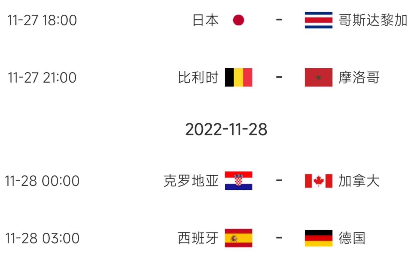 日本将在18点对阵上轮遭遇7球惨败的哥斯达黎加。比利时21点对阵摩洛哥;上届亚军克罗地亚0点对阵加拿大。