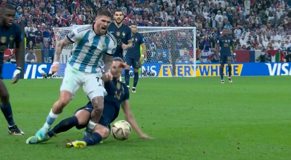 直播吧12月19日讯 世界杯决赛,阿根廷vs法国,下半场第50分钟,拉比奥特侧后方剪刀腿放倒德保罗,裁判向前者出示黄牌
