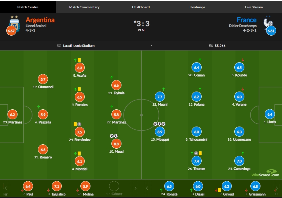 阿根廷:马丁内斯6.2、C罗梅罗6.6、佩泽拉5.9、奥塔门迪5.7、阿库尼亚6.3、帕雷德斯6.5、恩佐7.5、蒙特尔6.1、梅西8.8、劳塔罗5.8、迪巴拉6.6、迪玛利亚8.4、阿尔瓦雷斯6.3、麦克利斯特7.6、德保罗6.4、塔利亚菲科7.1、莫利纳5.9