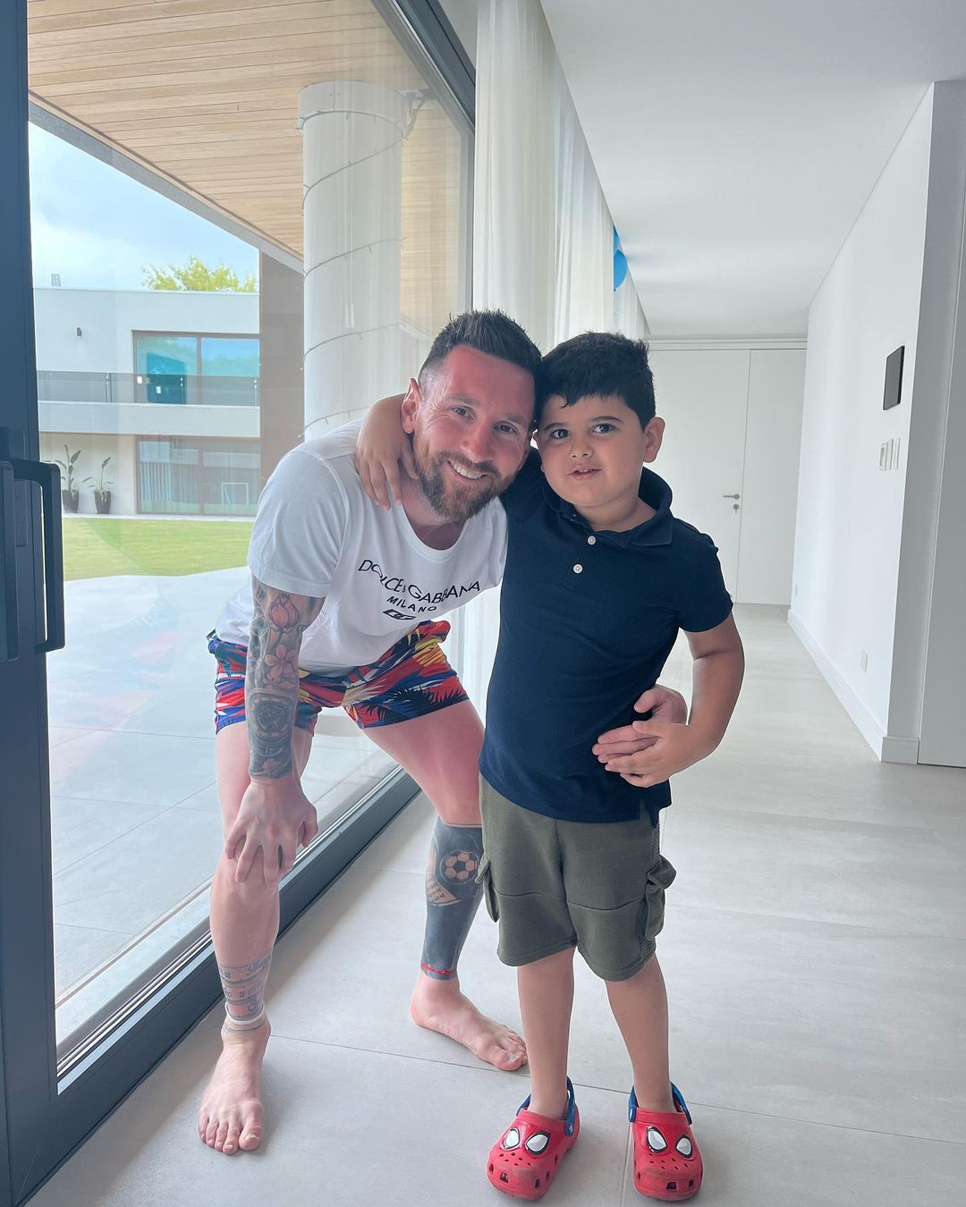 梅西与马斯切拉诺儿子合影,脚上还系着那根幸运红绳