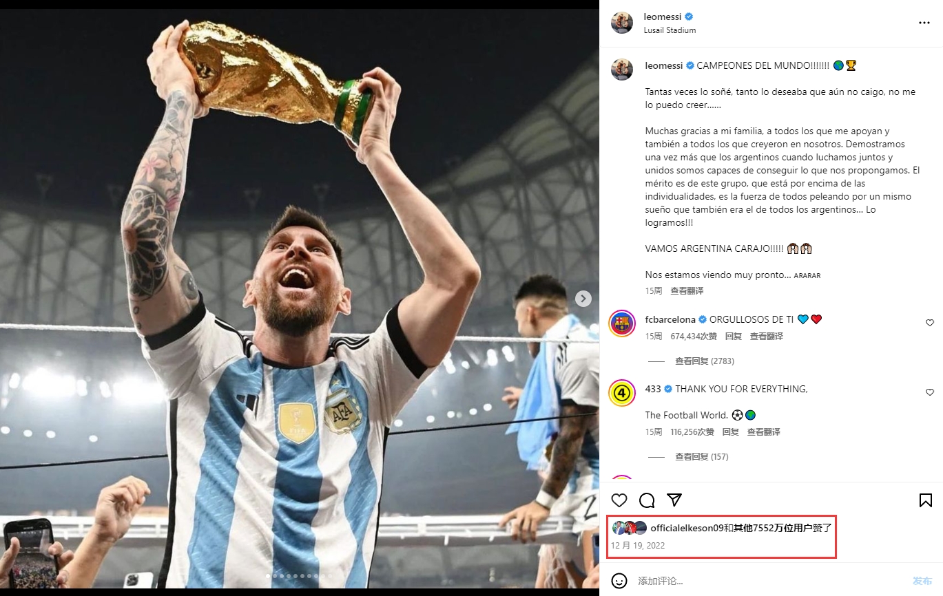 2022年12月21日,梅西这条ins的点赞数达到6311万,创所有社交媒体的点赞数历史之最。