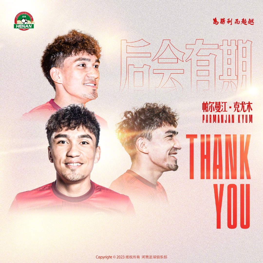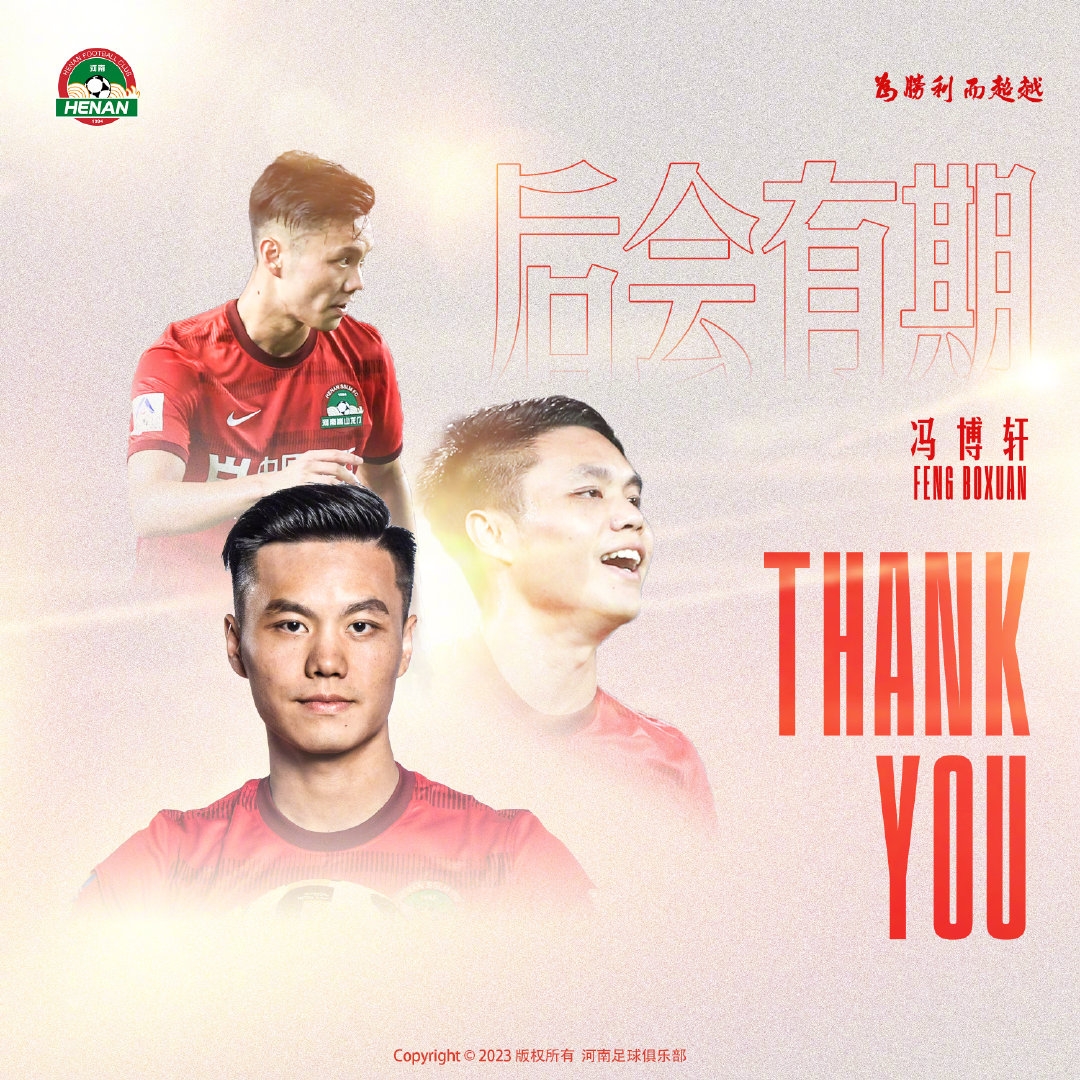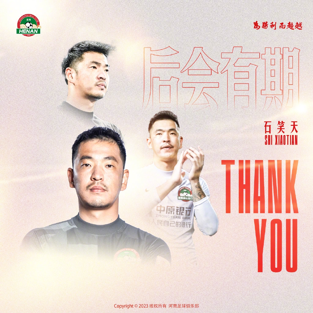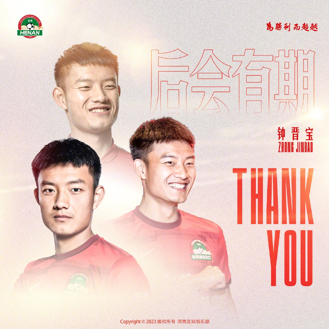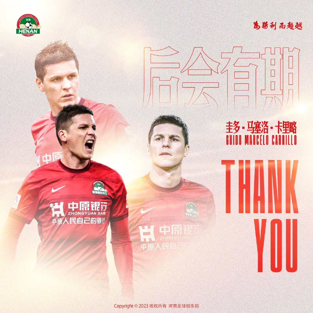 经双方协商一致,钟晋宝、马兴煜、冯博轩、赵宏略、圭多·马塞洛·卡里略、石笑天、徐世龙和帕尔曼江·克尤木(租借回归)八名球员与河南足球俱乐部的合同到期终止,正式离队。希望你们在以后的职业生涯中再创辉煌,河南球迷也期待你们再回航体相遇。