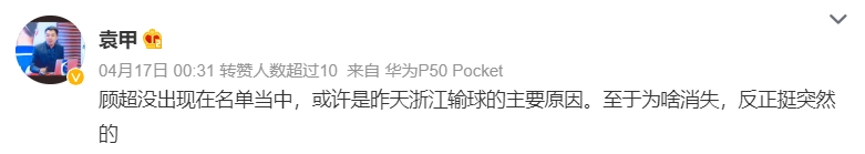 另外国内解说员袁甲也透露顾超消失。本赛季中超首轮,顾超没有出现在浙江队的大名单中。