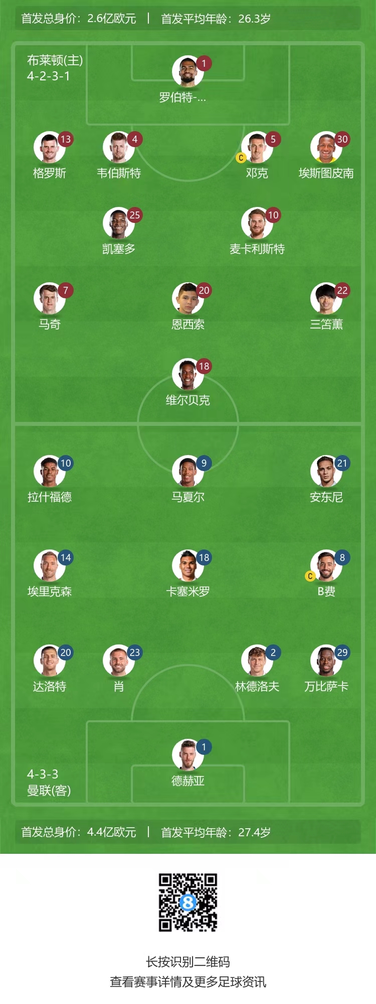 曼联首发:1-德赫亚、29-万-比萨卡、2-林德洛夫、23-卢克-肖、20-达洛特、18-卡塞米罗、14-埃里克森、8-B费、21-安东尼、9-马夏尔、10-拉什福德