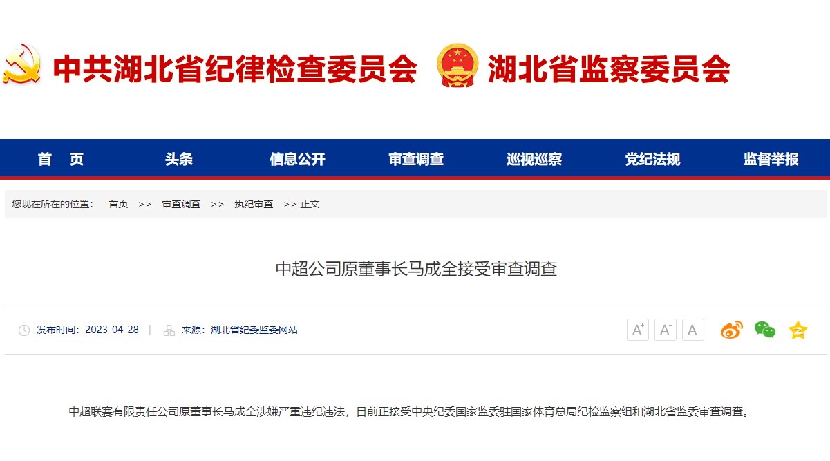 湖北省纪委监委网站消息,中超联赛有限责任公司原董事长马成全涉嫌严重违纪违法,目前正接受中央纪委国家监委驻国家体育总局纪检监察组和湖北省监委审查调查。