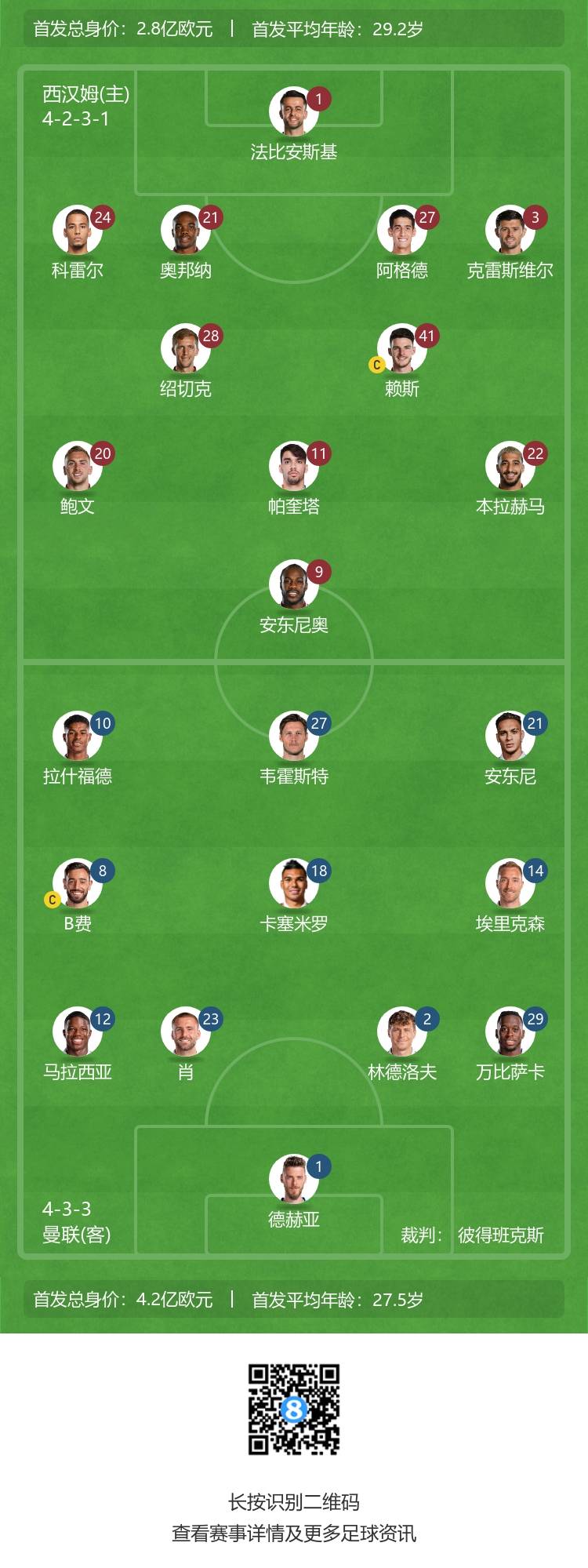 曼联首发:1-德赫亚、29-万比萨卡、2-林德洛夫、23-卢克肖、12-马拉西亚、14-埃里克森、18-卡塞米罗、21-安东尼、8-B费、10-拉什福德、27-韦霍斯特