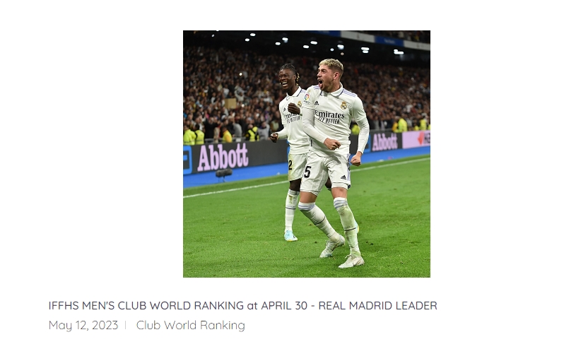 直播吧5月13日讯 IFFHS(国际足球历史和统计联合会)公布了最新一期俱乐部世界排名情况,统计区间是2022年5月1日至2023年4月30日。