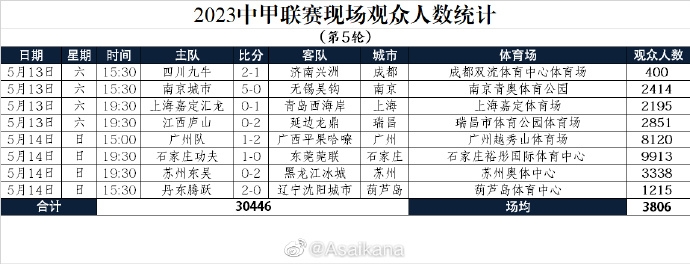 2023中甲联赛现场观众人数统计(第5轮) :场均3806人
