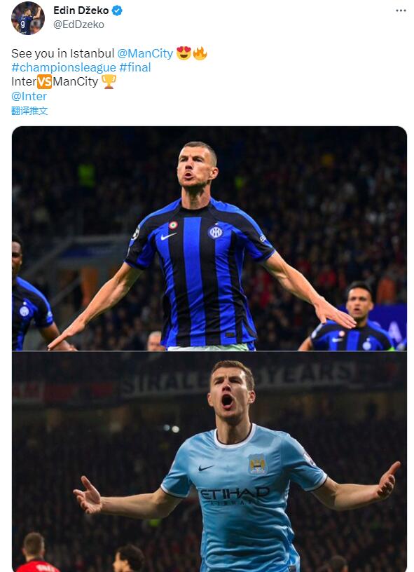 而效力国米的蓝月旧将哲科也关注着这场比赛,他也在赛后第一时间发推:“@曼城,伊斯坦布尔见。欧冠决赛:国米vs曼城。”