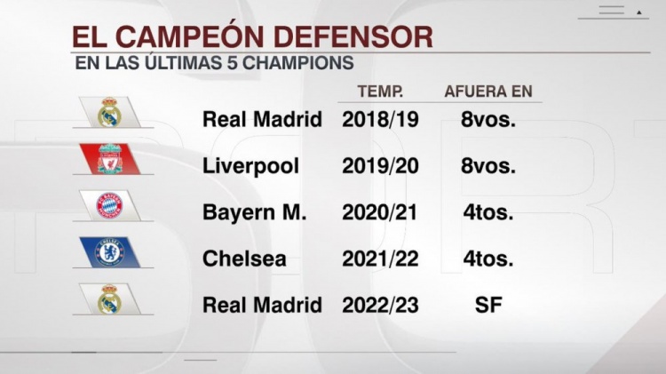 ESPN统计了近5年欧冠卫冕冠军下赛季的成绩,他们都未能连续晋级决赛,而最佳成绩就是皇马本赛季的4强。