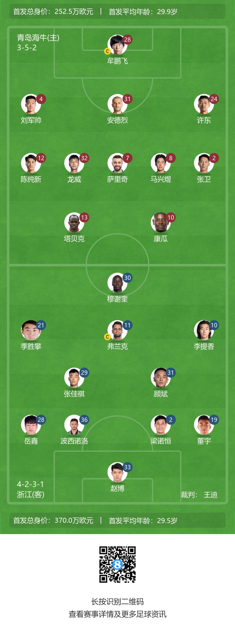 直播吧5月19日讯 今天19:35,中超第8轮,青岛海牛主场迎战浙江队。赛前双方公布首发阵容。