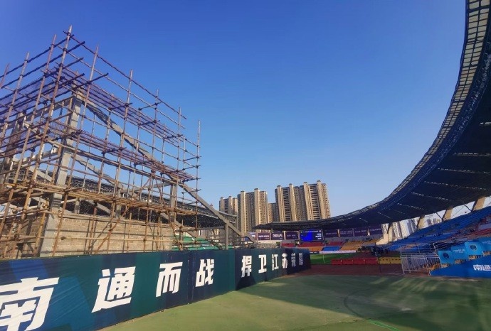 南通支云主场如皋奥体中心为满足球迷狂热的看球需求,正在热火朝天的改造体育场加装看台,目前体育场东、西、南三面为看台,座席共14603座。拟在足球场南、北两侧利用周边跑道用地增设看台,新增座位总数8000~10000座。