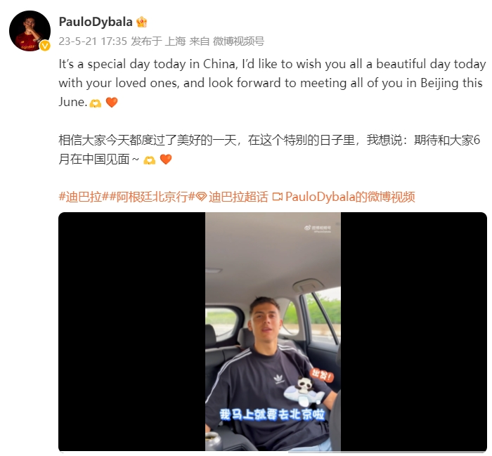 迪巴拉在视频中说:“hi我的朋友们,我知道今天是一个特别的日子,要和你爱的人享受这一天。我马上就要去北京啦,很期待见到你们大家,我爱你~”