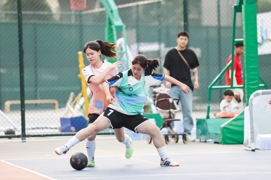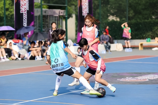 值得一提的是,与11人制的正规足球比赛不同,由于本次比赛就在街头体育场进行,氛围也相对轻松。随着动感的音乐,前来参赛的女孩们在场上切磋技艺,场下又互相为对手加油。“怒放竞技场”更像是为所有热爱足球的女孩子精心准备的一场足球party,在杭州街头树立起一道靓丽的风景线。