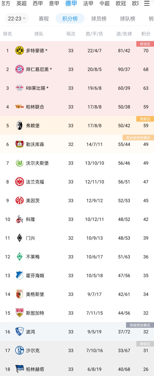 德甲积分榜,多特夺回榜首,领先拜仁2分,末轮主场胜美因茨将夺得联赛冠军。拜仁最后一轮将客战科隆。