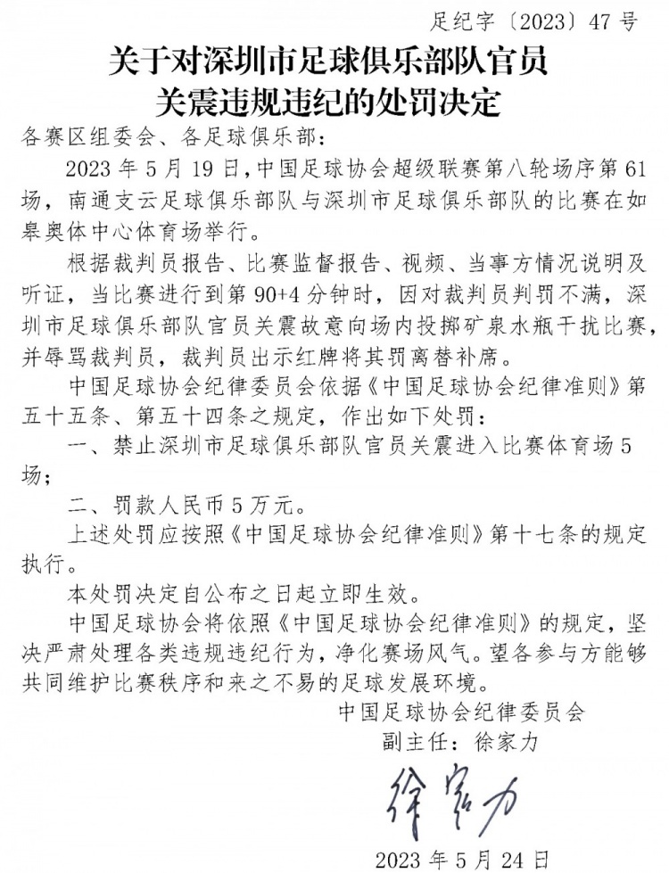 直播吧5月24日讯 今天,中国足协对深圳队官员关震做出了禁止进入比赛体育场5场、罚款5万的追加处罚。