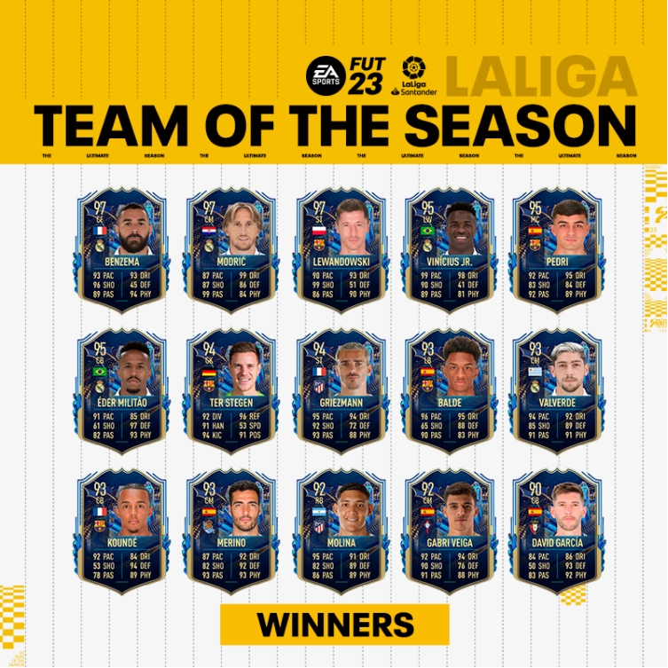 2022/23赛季西甲最佳阵容由1名守门员、5名后卫、5名中场和4名前锋组成。他们包括:特尔施特根(Ter Stegen)、巴尔德(Balde)、米利唐(Militão)、孔德(Koundé)、莫利纳(Nahuel Molina)、大卫·加西亚(David García)、莫德里奇(Modrić)、佩德里(Pedri)、巴尔韦德(Valverde)、梅里诺(Mikel Merino)、加布里·韦加(Gabri Veiga)、格列兹曼(Griezmann)、莱万多夫斯基(Lewandowski)、维尼修斯(Vini Jr)和本泽马(Benzema)。这些球员得到了最多的选票,成为了TOTS奖项历史上的第二届获奖者。