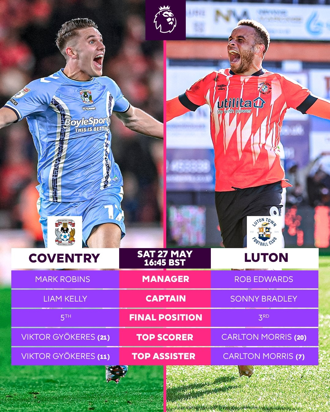 直播吧5月27日讯 英冠升级附加赛决赛,考文垂对阵卢顿,两队将竞争最后一个升超名额。赛前,官方公布首发名单。