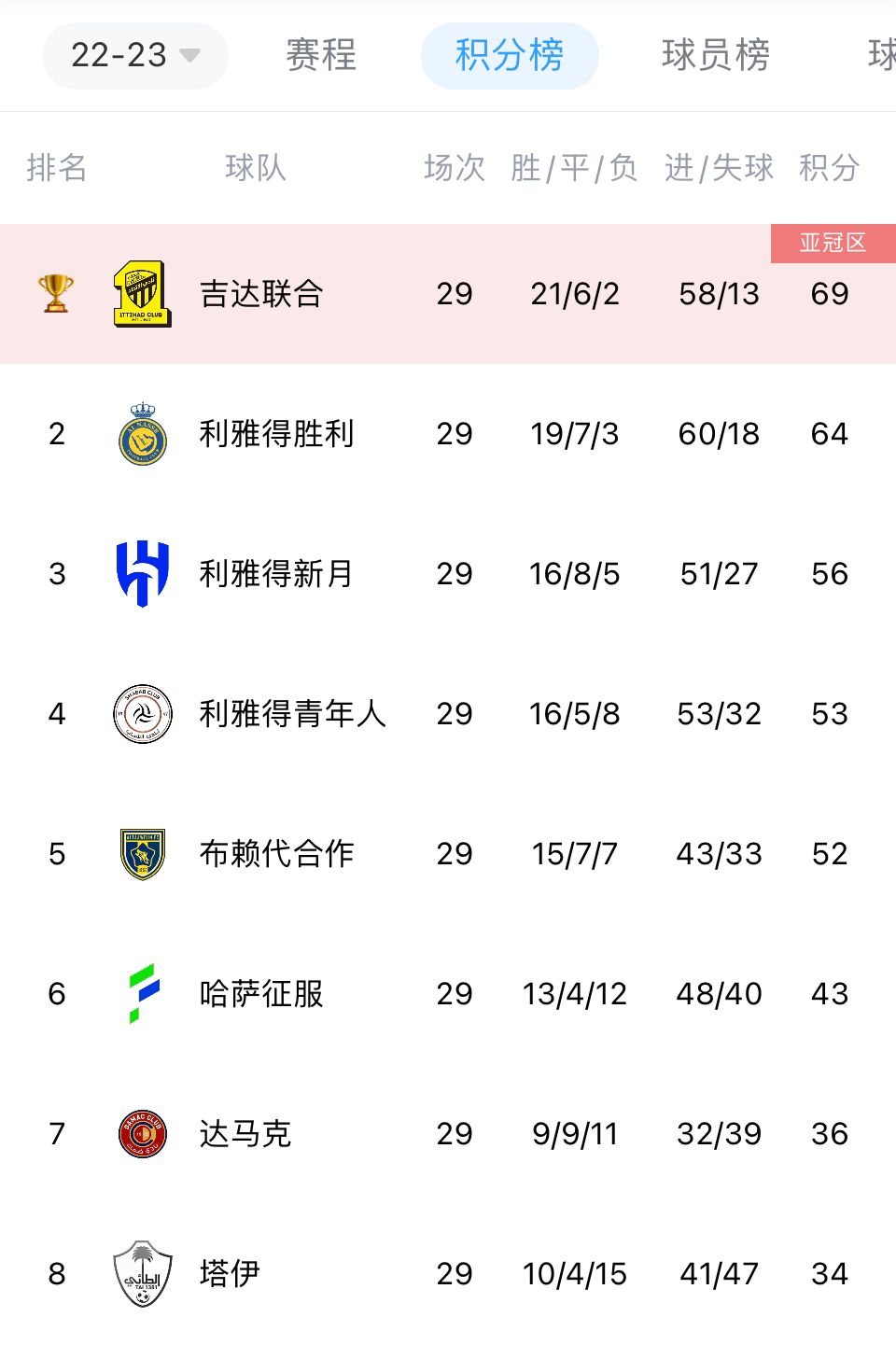 吉达联合提前一轮锁定沙特联冠军,利雅得胜利确定第二名