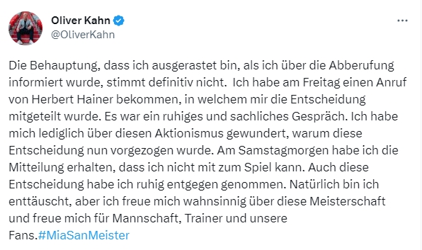 直播吧5月28日讯 据德国媒体《图片报》报道,由于卡恩得知自己被解雇时情绪完全失控,拜仁禁止他出席对阵科隆的比赛。但卡恩火速发社媒辟谣了此条新闻。