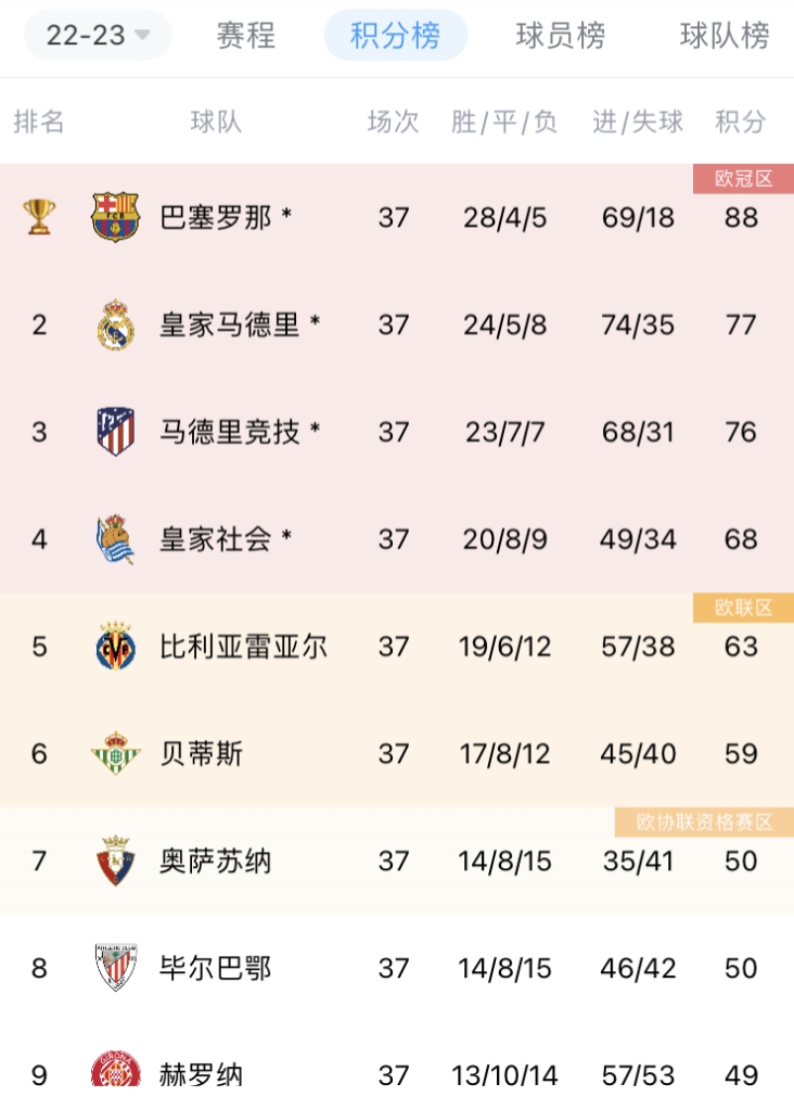 本赛季,西甲的前四球队已经确定,分别是巴萨、皇马、马竞和皇社。前四名中,皇社的排名已经不会改变,皇马和马竞之间二三名可能会在最后一轮出现变化,但前四的构成已经没有变数。
