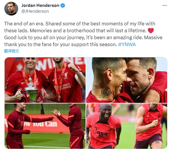 亨德森晒出了自己和菲尔米诺、米尔纳、张伯伦、凯塔的合照,并配文:“一个时代的终结。我和这几个小伙子共享了人生最美好的一些时刻。”