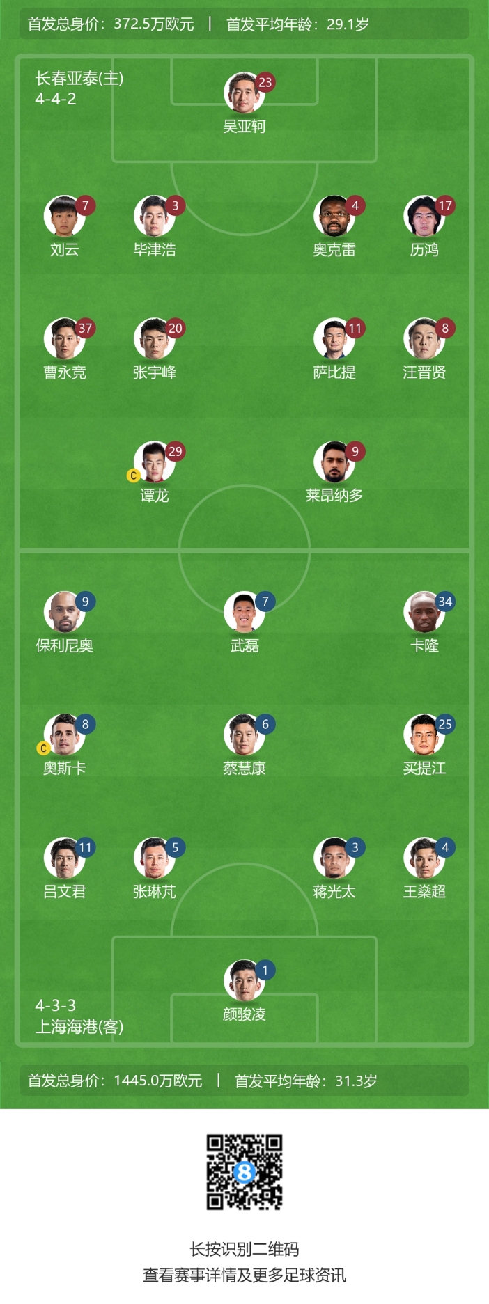 长春亚泰首发:23-吴亚轲、3-毕津浩、4-奥克雷、17-历鸿、7-刘云、8-汪晋贤、11-萨比提、20-张宇峰、37-曹永竞、9-莱昂纳多、29-谭龙