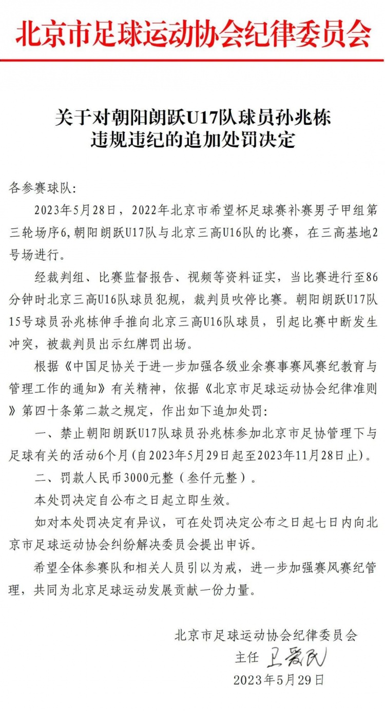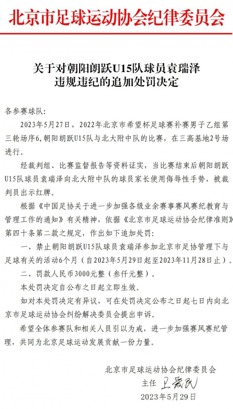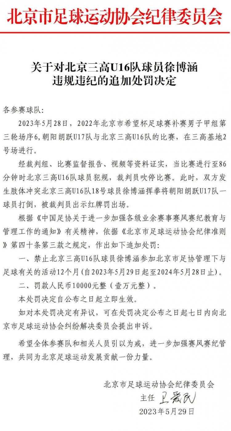 >北京足协对青少年比赛挥拳等行为重罚,一人被禁赛一年,2人半年