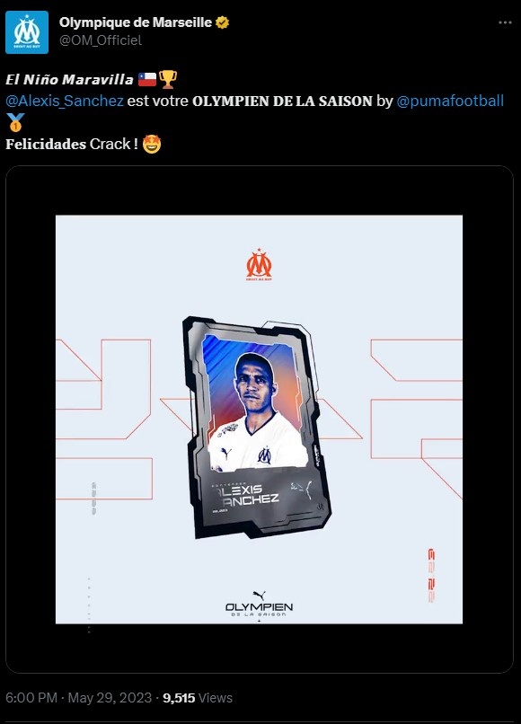 现在经过评选,桑切斯当选为马赛2022-23赛季最佳球员。