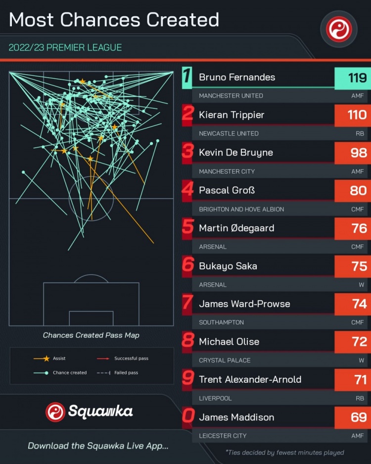 直播吧5月29日讯 本赛季英超联赛已经落幕,squawka也统计了本赛季创造机会情况,B费居首。