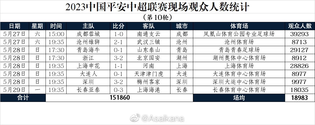 2023中国平安中超联赛现场观众人数统计(第10轮)