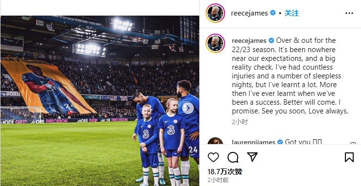 后卫里斯-詹姆斯发文进行了回顾:“22-23赛季终于结束了。这个赛季远未达到我们的预期,并且现实令我们倍感残酷。”