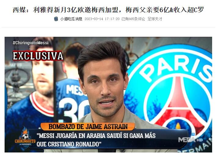 3月14日,西班牙六台:利雅得新月3亿欧邀梅西加盟,梅西父亲要6亿&收入超C罗