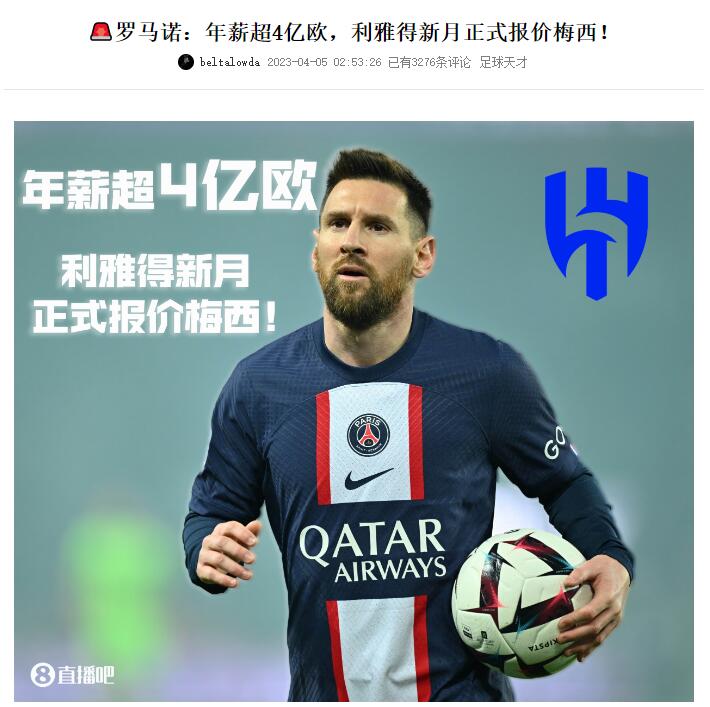 4月5日,罗马诺:利雅得新月正式报价梅西,年薪超4亿欧