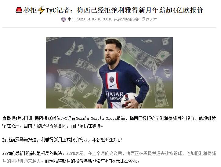 同一天,TyC记者:梅西已经拒绝利雅得新月年薪超4亿欧报价