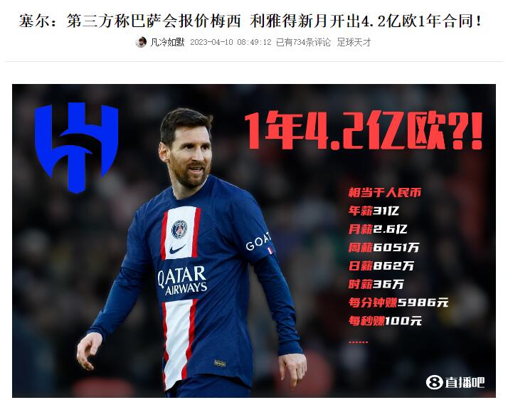 4月10日,西媒塞尔电台:利雅得新月给梅西开出4.2亿欧1年合同!