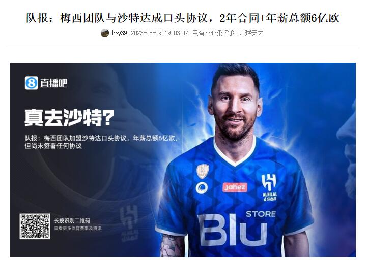 5月9日,法媒《队报》:梅西团队与沙特达成口头协议,2年合同&年薪总额6亿欧