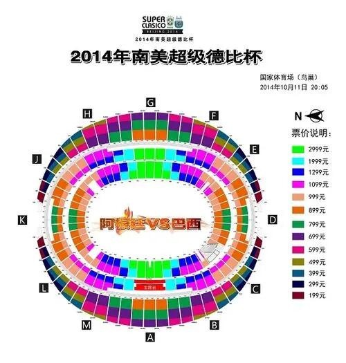直播吧5月30日讯 2014年10月11日,“南美超级德比杯”在北京的国家体育场即鸟巢举行,对阵双方是巴西队和阿根廷队,当时最高票价为2999元。