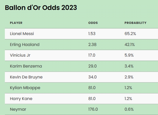 直播吧5月30日讯 2023年金球奖的赔率更新,梅西1.53低赔高居第一,获奖概率65.2%。哈兰德、维尼修斯等人紧随其后。