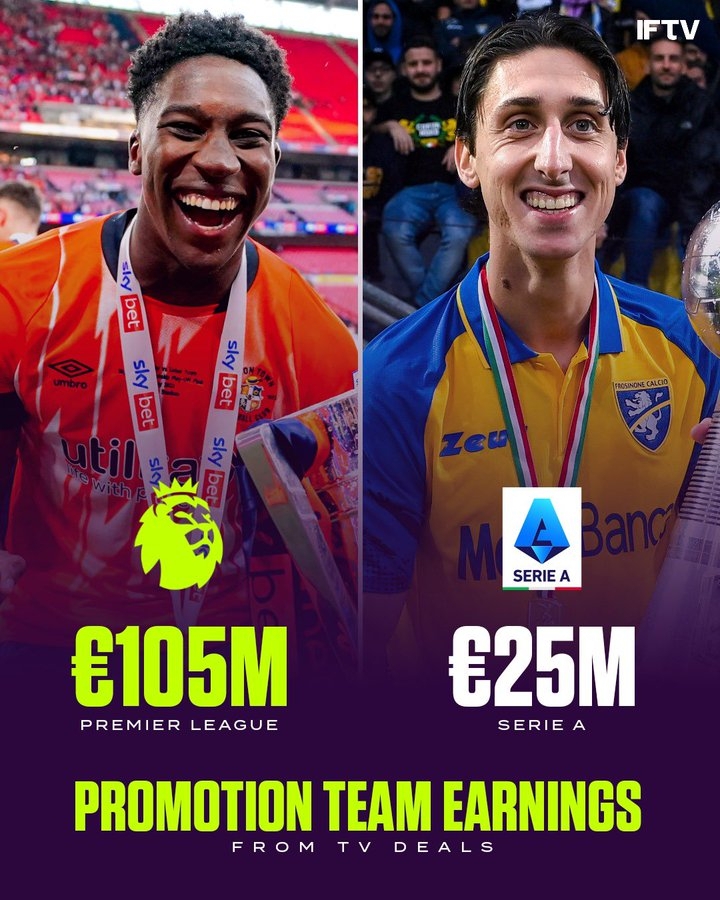 >💰升入英超的球队直接收入是升入意甲的球队的 4 倍